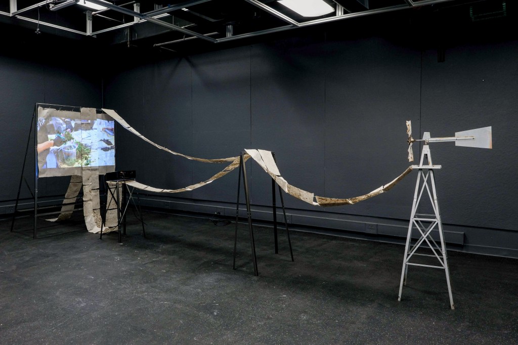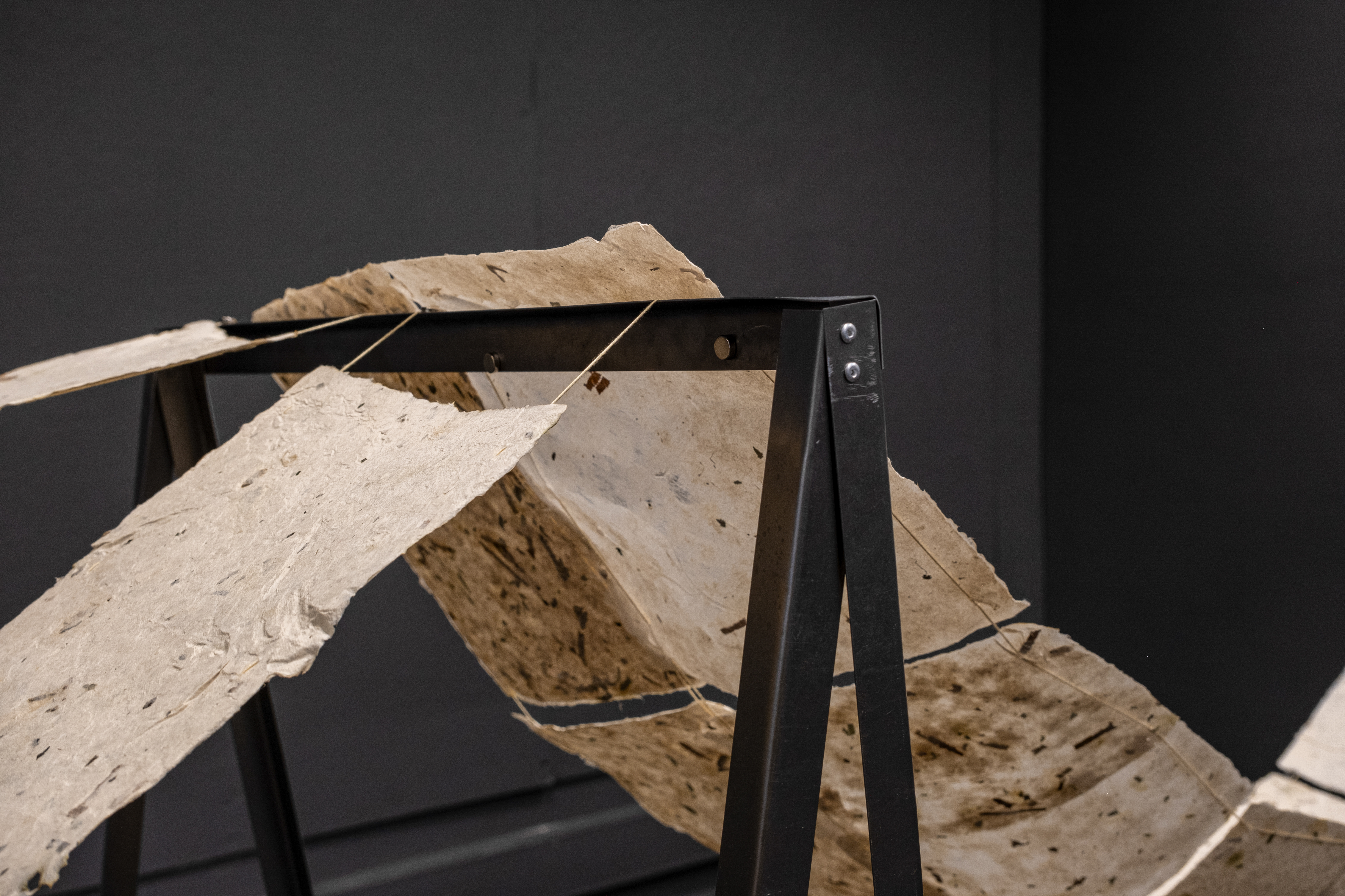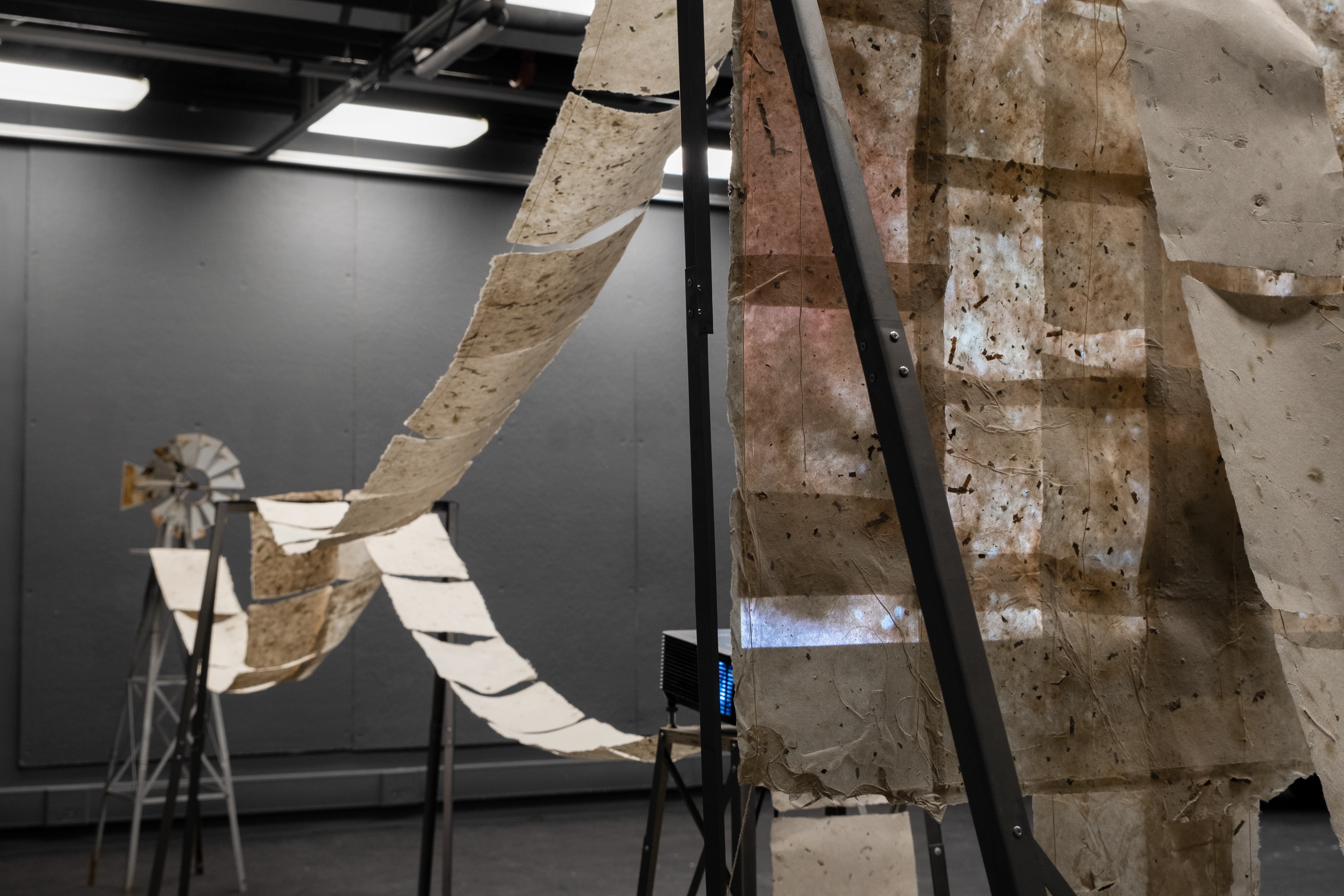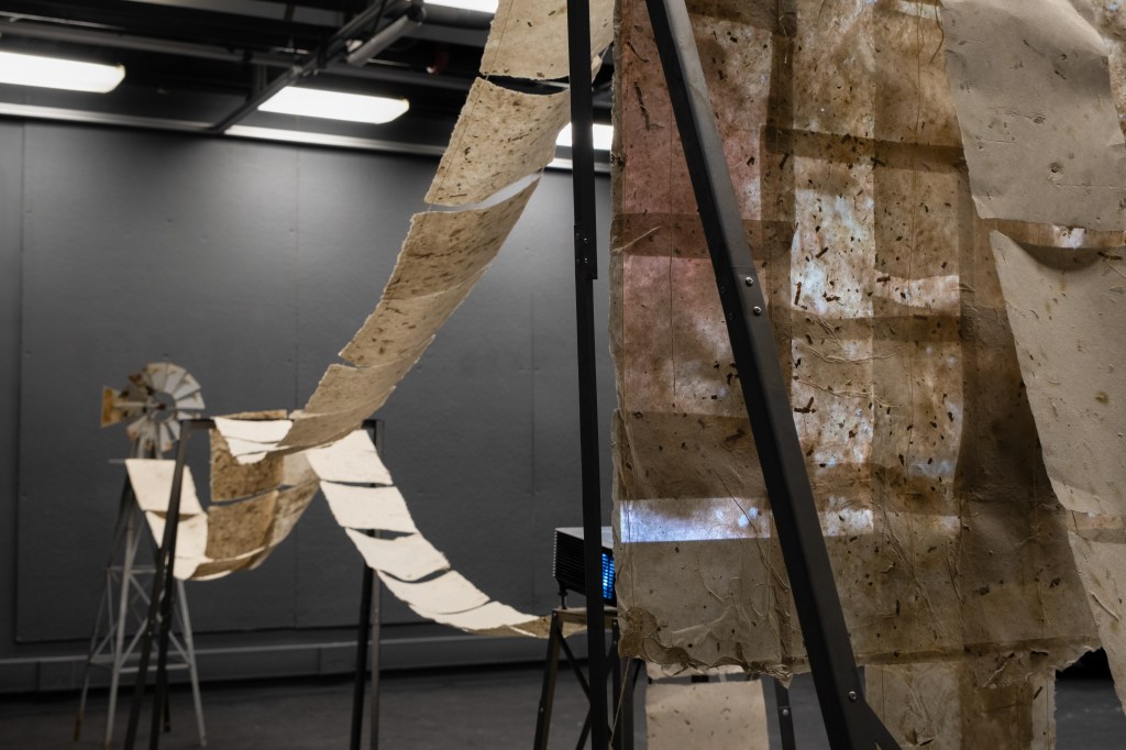 The installation combines a metal frame, hand-made paper, and cotton string to create a delicate yet structured representation of the garden’s systems and networks. Our project also introduces video as a narrative layer, projecting a visual score onto the paper. At the heart of the installation is a video that unfolds in three chapters—Dormanting, Collecting, and Publishing—each exploring a critical aspect of the garden’s life cycle and its transformation through our project.