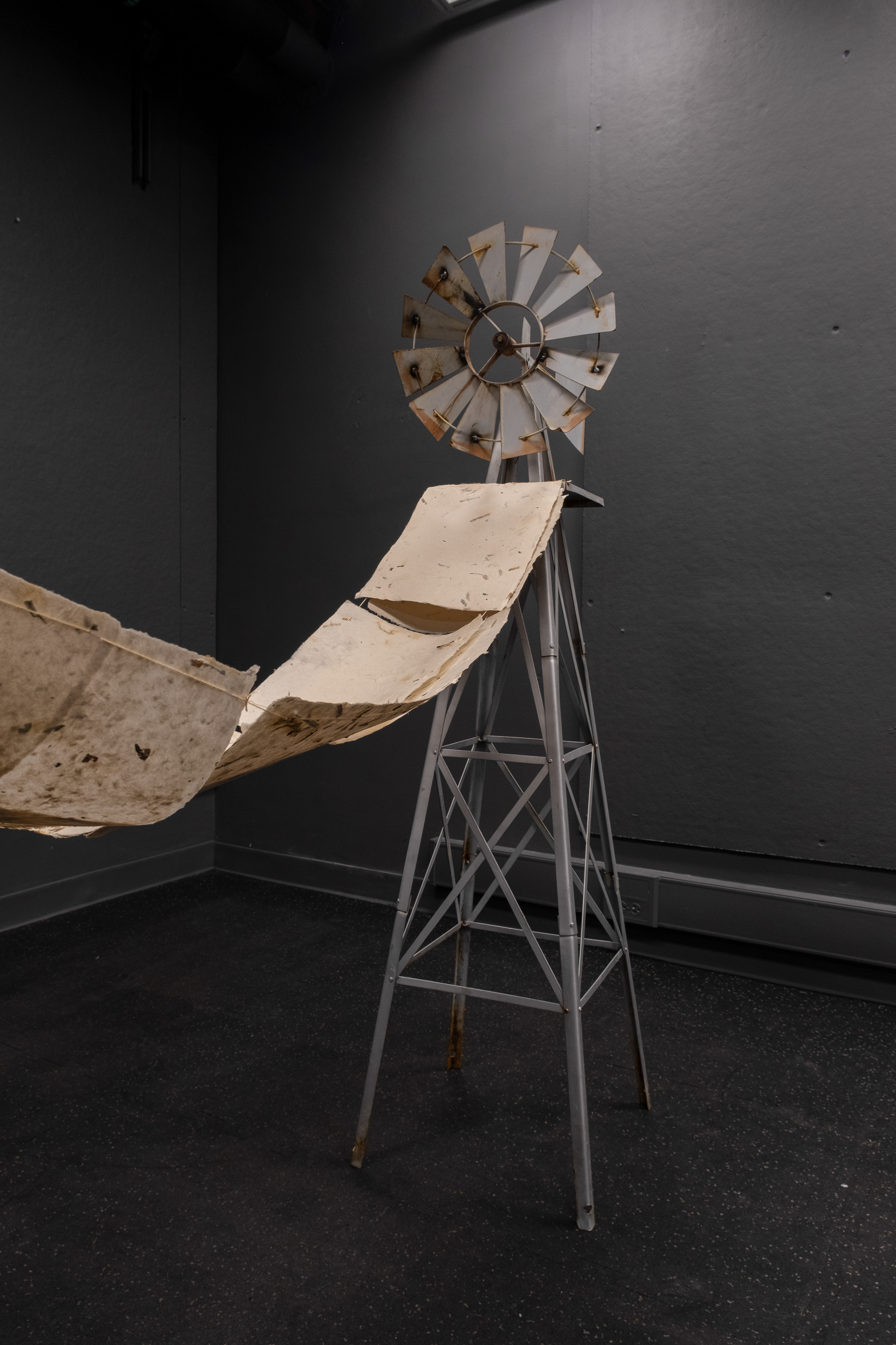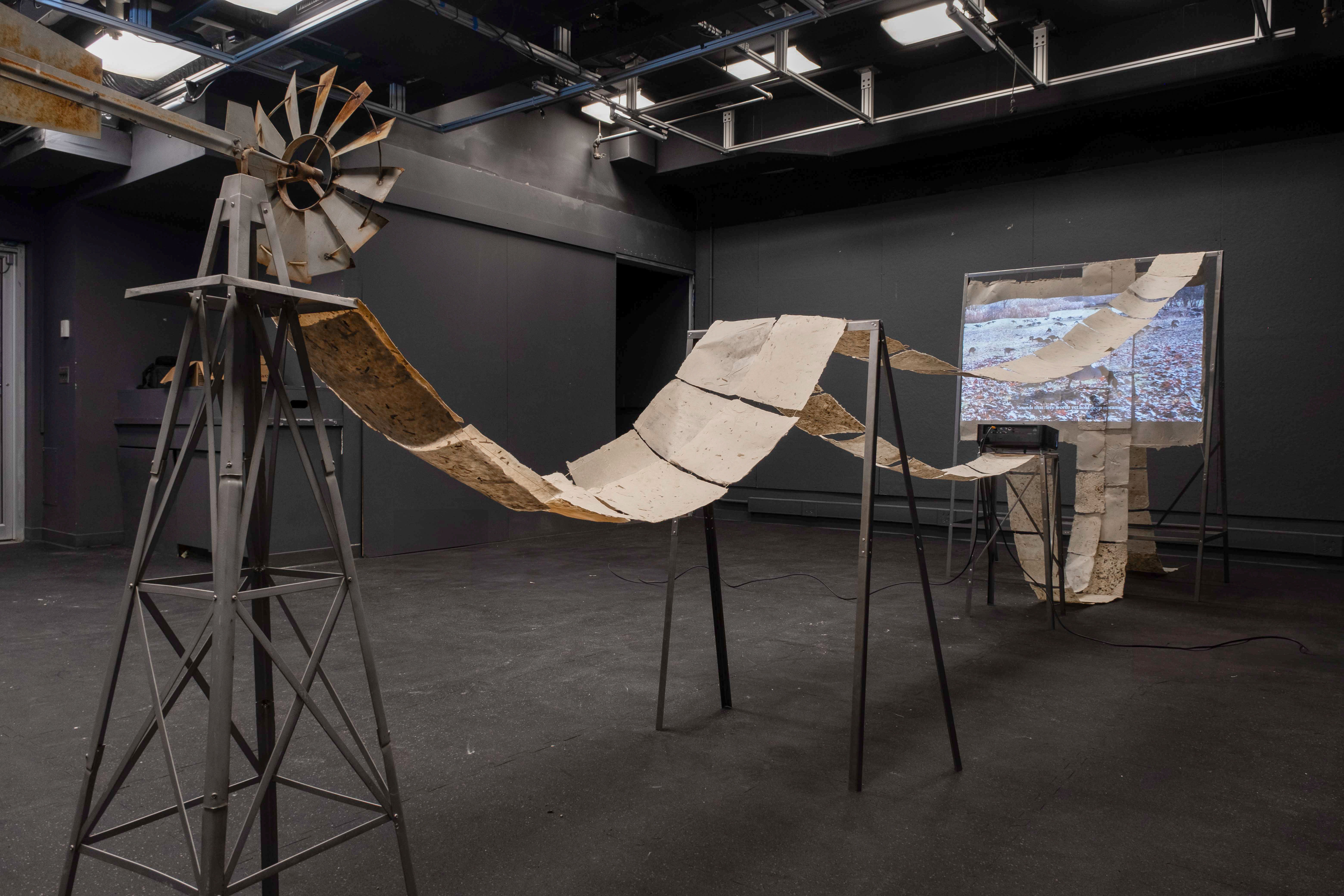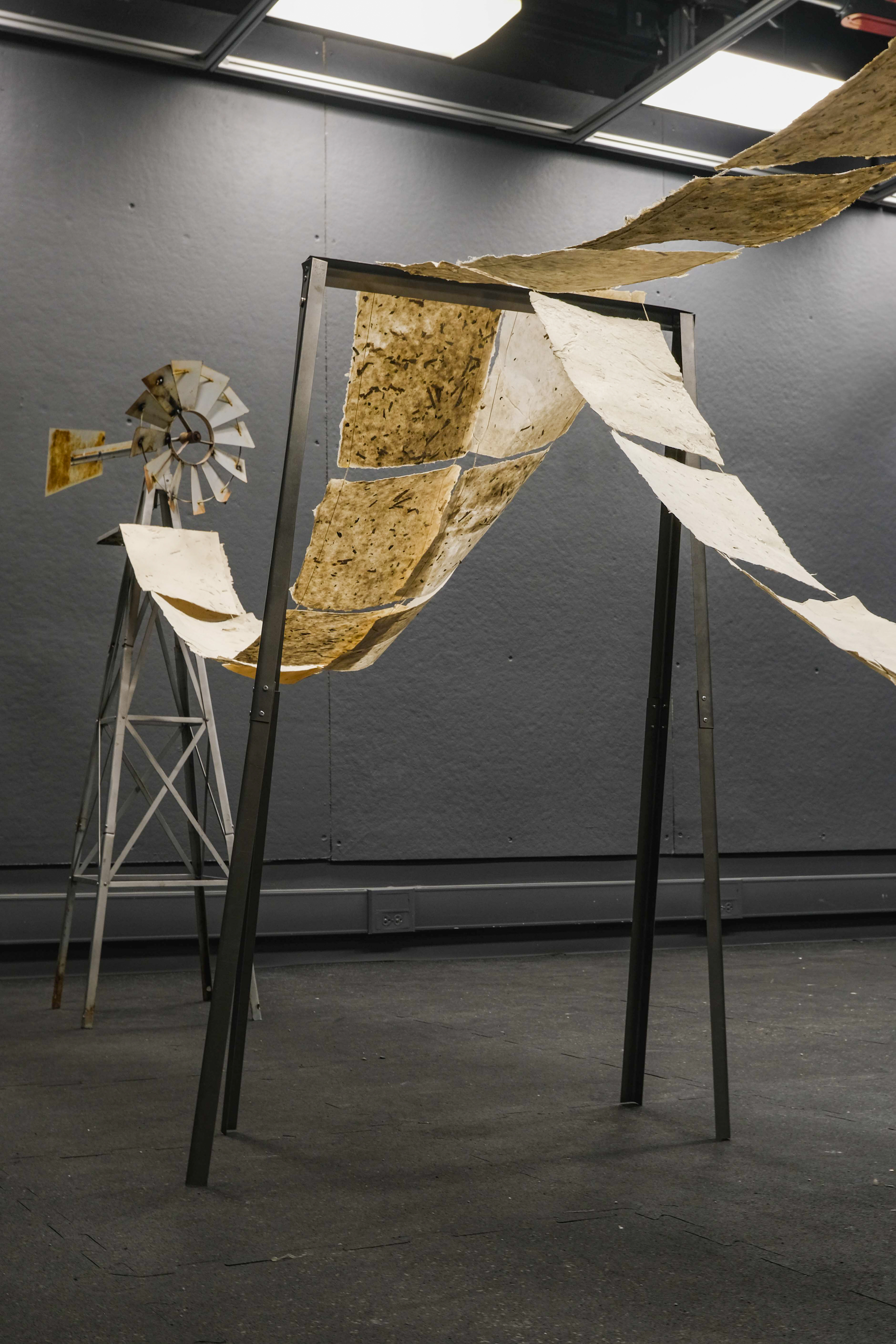 The installation combines a metal frame, hand-made paper, and cotton string to create a delicate yet structured representation of the garden’s systems and networks. Our project also introduces video as a narrative layer, projecting a visual score onto the paper. At the heart of the installation is a video that unfolds in three chapters—Dormanting, Collecting, and Publishing—each exploring a critical aspect of the garden’s life cycle and its transformation through our project.