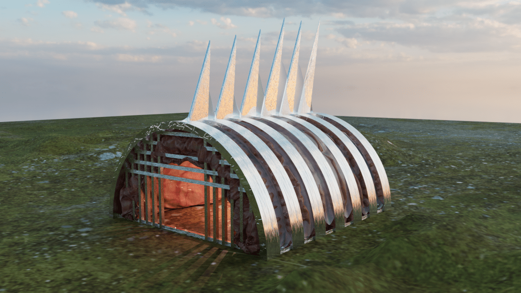 In Torsonset, the organs, bones, and skin of the human torso are reimagined as architectural elements, creating a harmonious synthesis of the natural and the constructed. The patchwork model also ensure the quick assembly of the house.The soft and the warmth of organs are reimagined as the inner padding of the housing which provides insulation. The chest cage, including the ribs and the spine, inspires the frame construction of Torsonset. Compare to the original Quonset, which is patched up by curved steel plates, the splicing model of Torsonset is connected by the “spine” on the top of the structure. The rain-proof layer, the skin, uses plastic wraps to cover the entire body.